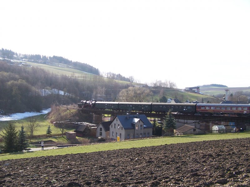 52 8075-5 mit dem Schwarzenberger Museumszug und ein paar Chemnitzer Wagen zwischen Schwarzenberg und Grünstädtel, 30.März 2008