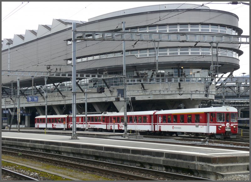 Vor dem Berufsbildungszentrum Luzern fährt ein Pendelzug der ehemaligen LSE, jetzt Zentralbahn, nach Engelberg vorbei. (18.03.2008)