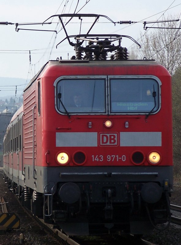 Da mir die 143er ja so am Herzen liegen: Frontalaufnahme von 143 971 mit einer Regionalbahn nach Wiesbaden bei der Einfahrt von Wiesbaden-Biebrich, 08.03.08.