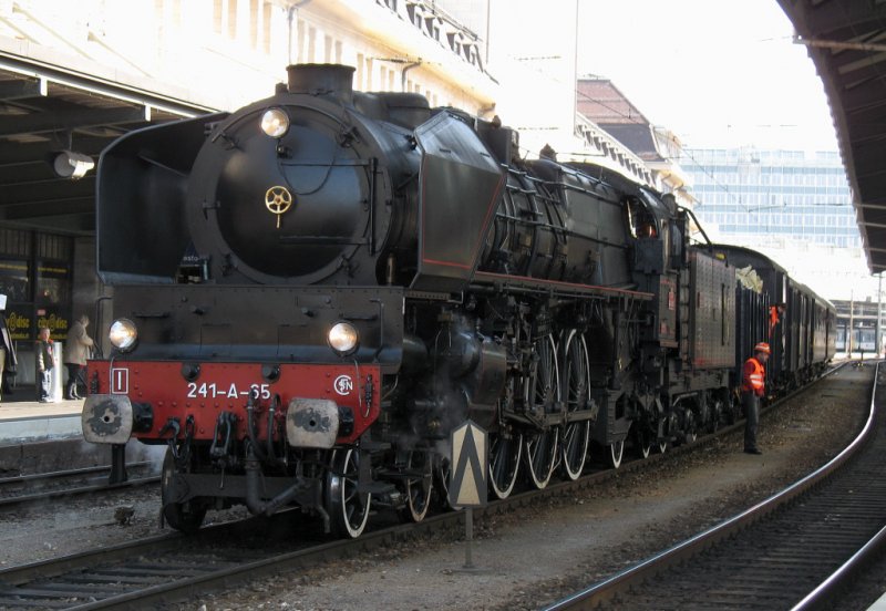 Die Dampflokomotive 241-A-65 bei ihrer Instruktionsfahrt im Bahnhof Lausanne