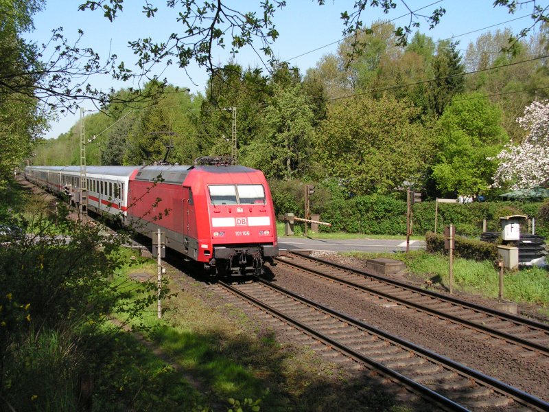 Am 8.5.08 gegen 10:50 Uhr rast 101 106 mit ihre IC auf der KBS 380 nach dem Halt in Nienburg Richtung Hannover.
