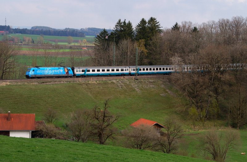 101 016 (Unicef) mit IC 82 bei Aßling (16.04.2008)