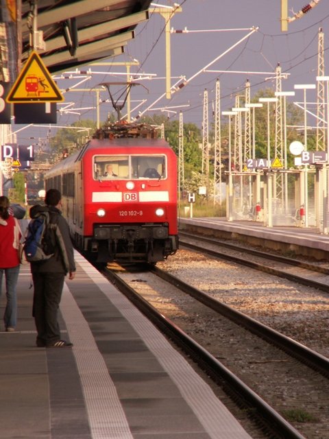 120 102-9 mit IC aus Köln bei der Einfahrt in den Bahnhof Greifswald