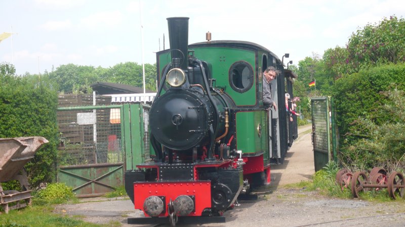 Lok des Feldbahnmuseums Frankfurt Fährt vom Tor in Richtung Rebstockbad.