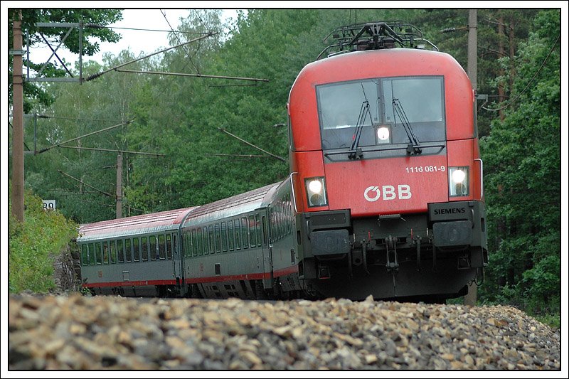 1044 072 bespannte am 22.5.2008 den OEC 536 "Jacques Lemans" von Villach nach Wien. Die Aufnahme entstand bei der Talfahrt der Semmering Nordrampe irgendwo mitten im Wald zwischen Klamm-Schottwien und Eichberg.