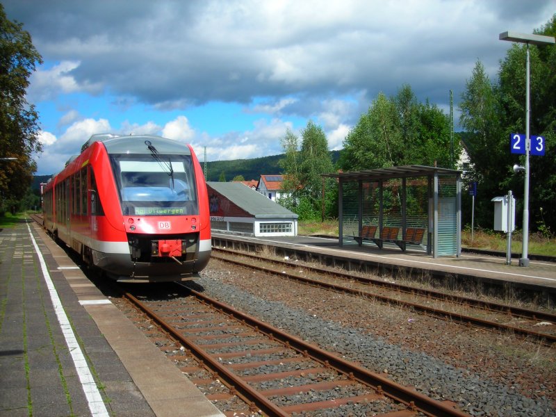 VT 26 kurz vor dem Siegelsbacher Bahnhof. Noch den Buckel runter, noch ne Kurve und dann ist er schon im Bahnhof.