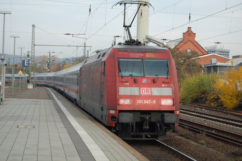 101 047 "Feuerwehr" am IC 2374 nach Stralsund bei der Ausfahrt aus Göttingen. 2.11.2008. Die Lok macht einen sehr schlechten Eindruck!
