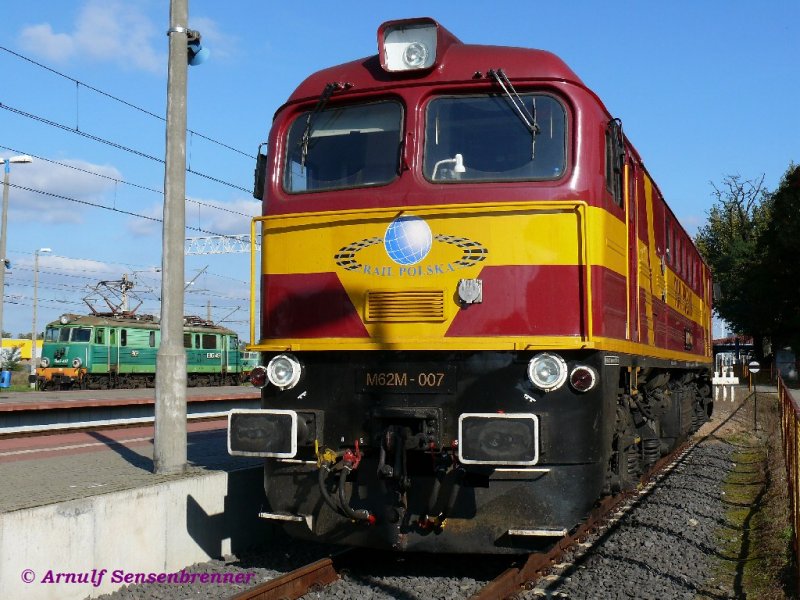 Die PKP EU07-348 mit den gewöhnungsbedürftigen viereckien Scheinwerfereinfassungen, welche diese Lok, aus der von Cegielski 1983-94 gebauten späten Nachbauserie, erhielt.