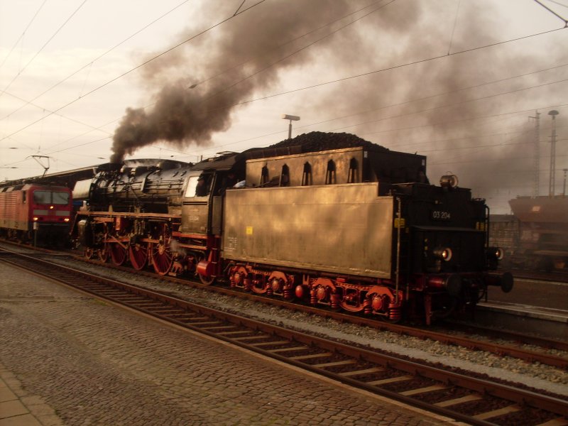 die orientrote 151 134 wird am 14.10.2008 neben dem Stellwerk in Geislingen für den Schiebedienst an der Steige aufgerüstet,während 146 209 mit ihrem IRE nach Lindau sogleich an Gleis 2 einfahren wird.