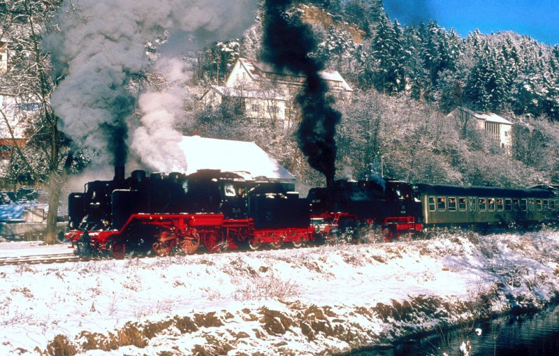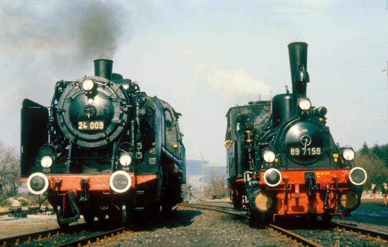 Die 59 004 mit einem  Nostalgiezug bei der Ausfahrt aus dem Bahnhof.