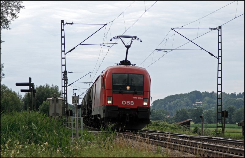 Die 1116 262 bringt einen Kessel-Bomber durch das Chiemgau in Richtung Salzburg. (09.07.2008)