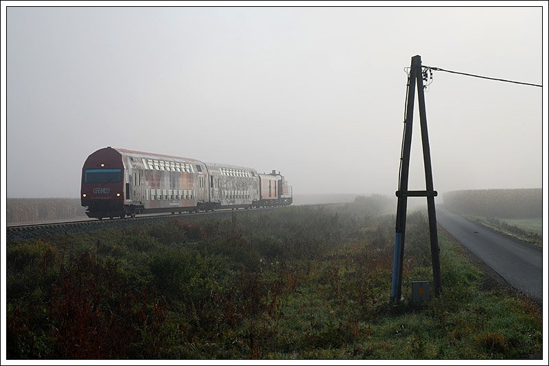 R 8505 von Graz nach Wies-Eibiswald am 11.10.2008 zwischen Groß St. Florian und Frauental aufgenommen. von 1.5.08 bis 26.10.2008 verkehrt dieser Zug mit zwei Stockwaggons und einem zusätzlichen Fahrradwaggon. In der übrigens Zeit kommen Triebwagen der Reihe VT 70 zum Einsatz.