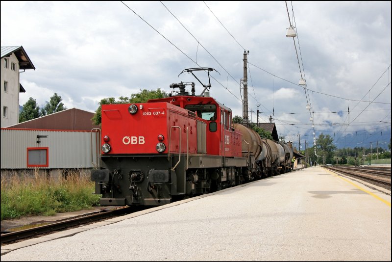 "Modellbahngerecht" steht die Innsbrucker 1063 037 mit ihrem Vier-Wagenzug in Brixlegg und wartet auf die Abfahrt nach Wörgl. In Deutschland sind solche Bilder leider etwas mangelware... (08.07.2008)