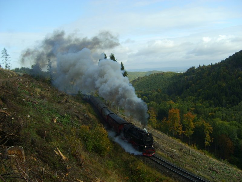 Zug 8941 schnaufend aus dem Tunnel kommend fährt hinauf nach Drei Annen Hohne und weiter zum Brocken. An dieser Stelle entstand scheinbar ein neuer Fotopunkt durch die Rodung des Waldes an jener Stelle. 4.10.2008 11:20
