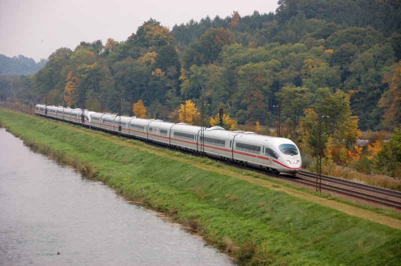 Zwischen Günzburg/Donau und dem in der Zwischenzeit stillgelegten Bahnhof Neuoffingen folgt die Kursbuchstrecke 980 der parallel verlaufenden Donau. Hier eine ICE 3-Doppelgarnitur vor den sich herbstlich verfärbenden Donau-Auen. (30.09.2008).