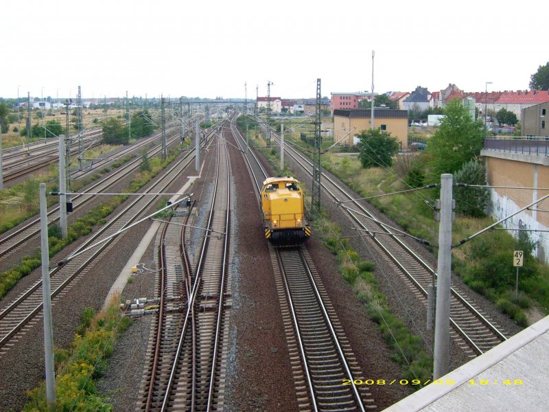 Eine Lok der GSG Knape Gleissanierung fuhr am 05.09.08 solo durch Bitterfeld. Es ist nur ein Nachschuss da ich nicht die Brückenseite wechseln konnte.