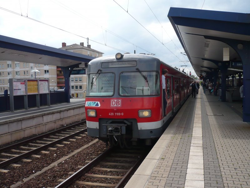 S-Bahn Rhein-Main: Der Triebwagen 420 789/289 ist gerade als S8 von Wiesbaden Hbf gekommen und fährt jetzt in die Offenbacher Abstellanlage.Die Anzeige ist schon auf die Rückfahrt nach Wiesbaden