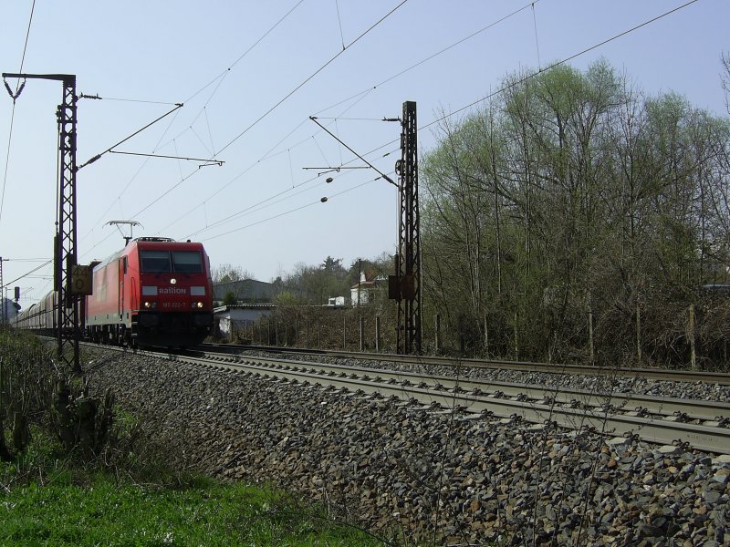 185 222-7 zieht am 9.4.2009 einen leeren Kohle-Gz über die Filsbahn in Richtung Ulm. Aufgenommen kurz nach der Durchfahrt des Bahnhofes von Göppingen.