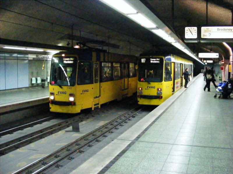 Zwei DUEWAG-Stadtbahnwagen M8 der EVAG im Bahnhof Martinstraße in Essen-Rüttenscheid als Züge der Linie 107 nach Katernberg (Hanielstraße) und Bredeney am 18. Dezember 2008.