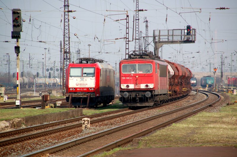 Am 04.04.09 durchfährt 155 108 mit einem Güterzug Großkorbetha und passiert dabei 185-CL 005 der Veolia.
