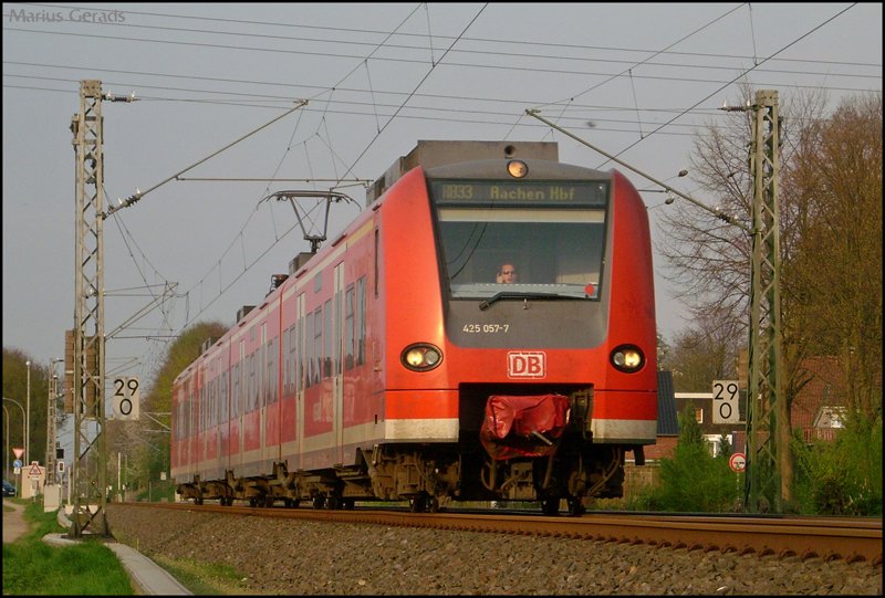 425 064 als RB11078 nach Duisburg Hbf  ließ sich am 11.4.09 an der ehem. Anrufschranke in Geilenkirchen fotografieren.