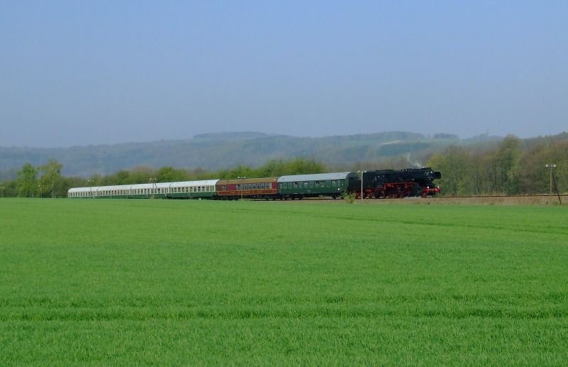 52 8047-4 mit ihrem Ostersonderzug erreicht nach Absolvierung des Anstiegs aus dem Elbtal die Hochfläche bei Lohmen.