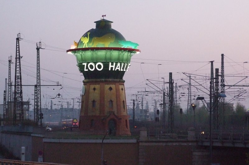 Am frühen Morgen (6 Uhr) verlässt der RE 3604 Halle/Saale Hbf nach Hannover und fährt zuerst einmal noch am ehem. Wasserturm in Halle vorbei, der hier beleuchtet, Werbung für den lokalen Zoo macht.
