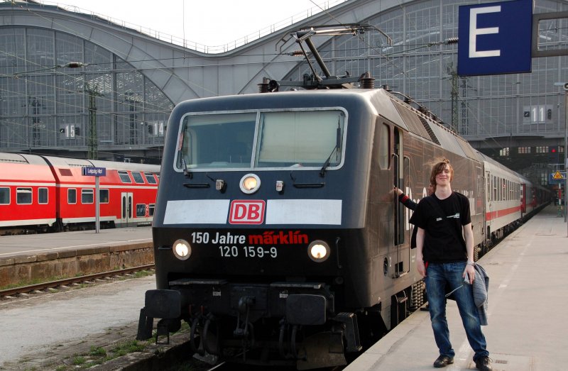 120 143 bespannt am 04.04.09 den IC 73929 von Leipzig nach Nürnberg, hier bei der Durchfahrt in Großkorbetha.