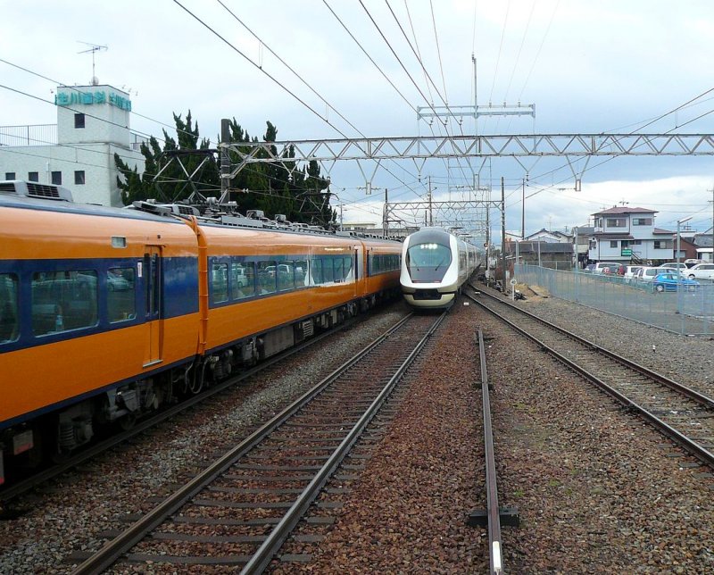 Der Kintetsu-Konzern: Grundfarbe gelb für zuschlagspflichtige Intercityzüge. Hier: Kreuzung zweier Züge in Shiroko,23.Februar 2009.Rechts kommt einer der beiden 6-Wagenzüge Serie 21010 (gebaut 2002),die auch vom Kaiser genutzt werden. Der Kintetsu-Konzern betreibt 582km Bahnlinie (1500V Gleichstrom), das meiste 1435mm Normalspur, daneben rund 159km 1067mm-Spur und 7km 762mm-Spur.