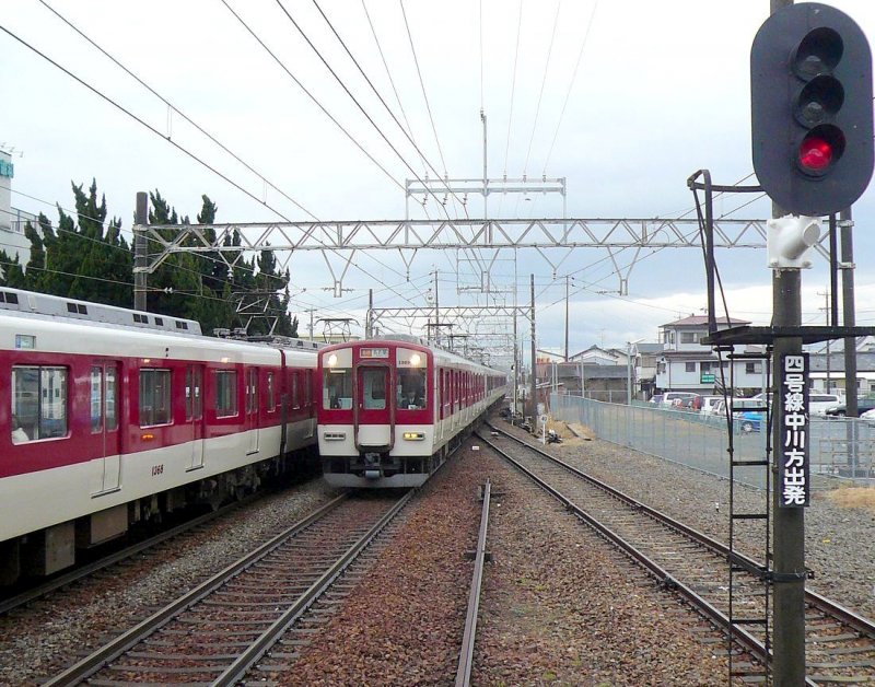 Der Kintetsu-Konzern: Grundfarbe rot für Lokal-, Eil- und Pendlerzüge. Im Bild: Kreuzung zweier Züge in Shiroko,23.Februar 2009; rechts ein Zug mit 2-Wagen Zusatzmodul 1269/1369 (Serie 1200,gebaut ab 1987).