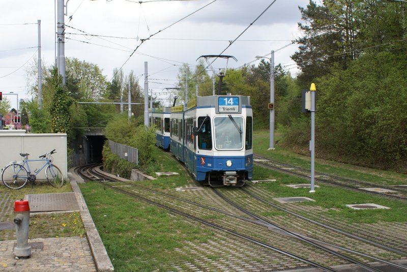 Eine Komposition der Linie 14 bestehend aus dem Be 4/6 2002 und 2310 fährt am 17.4.09 in Milchbuck ein.