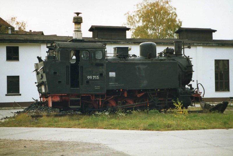 Im Oktober 1993 konnte ich diese Aufnahme auf dem ehemaligen Gelände des Wilsdruffer Bahnhofes machen. Die 99 715 auf einem der letzten Gleisstücke im Bahnhofsbereich