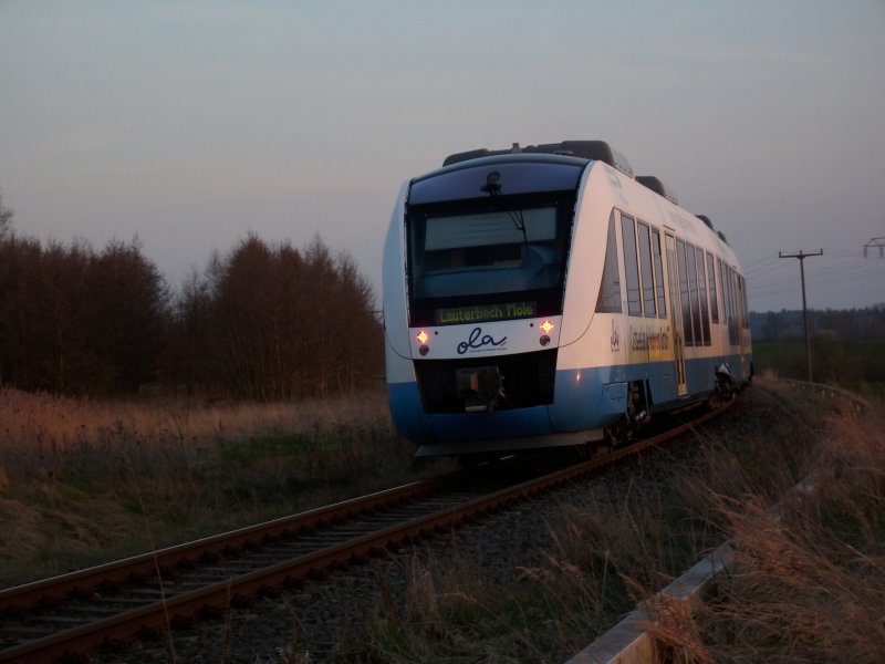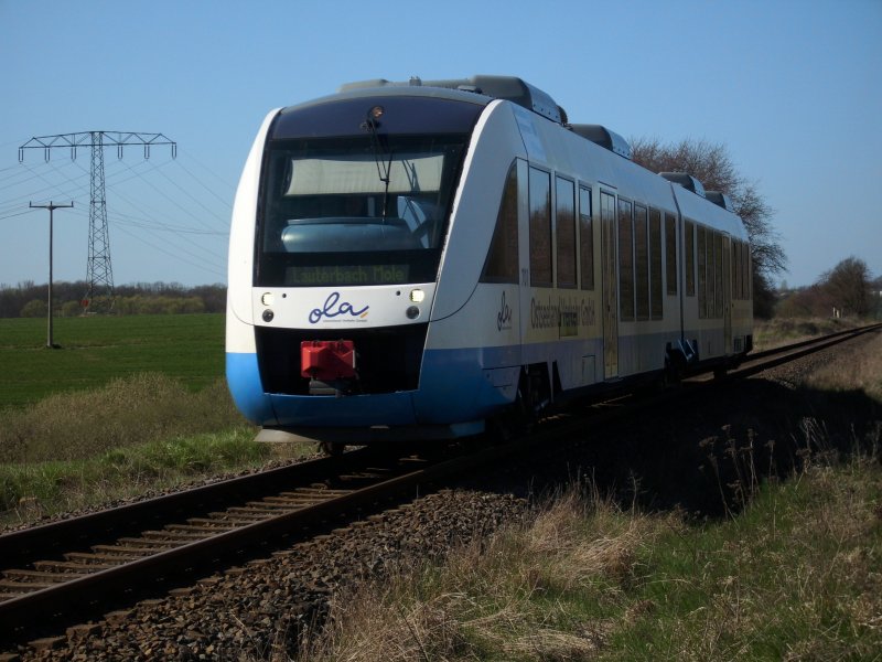 Am 19.April 2009 kam mir OLA-Triebwagen 701 bei Bergen/Rügen von Lauterbach Mole entgegen.