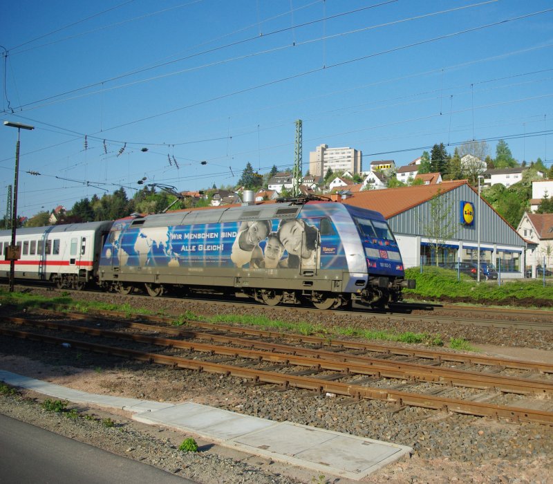 101 047-9 "150 Jahre Deutscher Feuerwehr Verband" mit IC nach Leipzig. Aufgenommen am 25.04.2009 zwischen Friedlos und Mecklar.