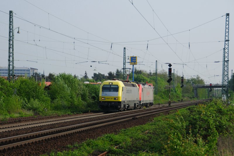 Bewußt schräggestellt: Die Dynamik dieses Duos eingefangen... Nachschuß auf E 484 901-CR und ES 64 P-001. Im Hintergrund der Bahnhof von Bensheim-Auerbach. (22.04.2009).
