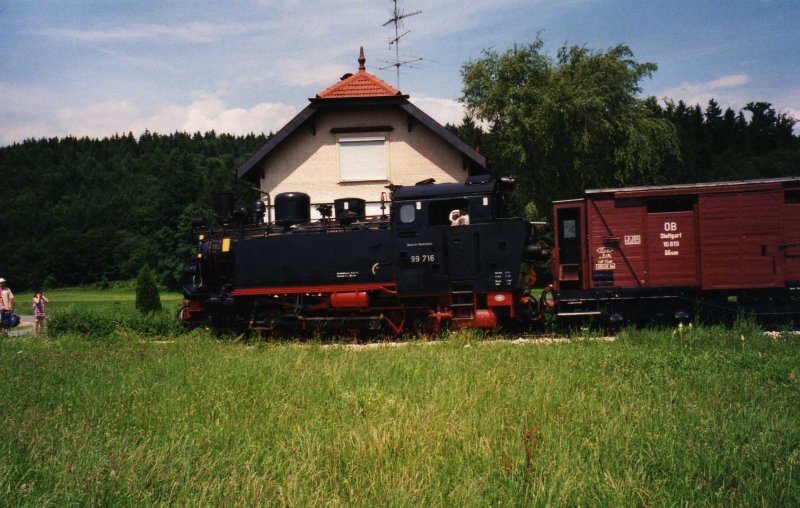 Zwischen Ochsenhausen und Warthausen konnte an einem schönen Julisonntag im Jahre 1997 in Reinstetten die 99 716 mit ihrem Mittagspersonenzug beobachtet werden.