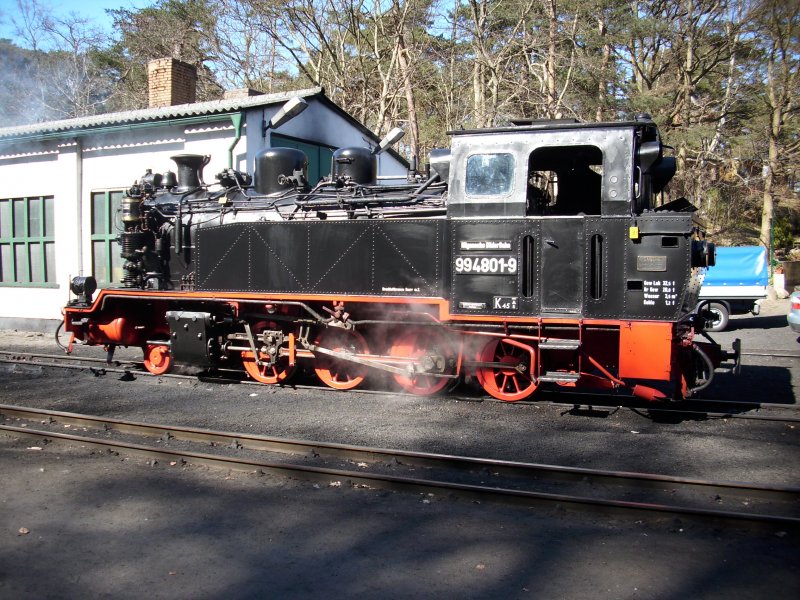 99 4801 bei der Pause am 18.April 2009 vor dem Lokschuppen in Göhren.