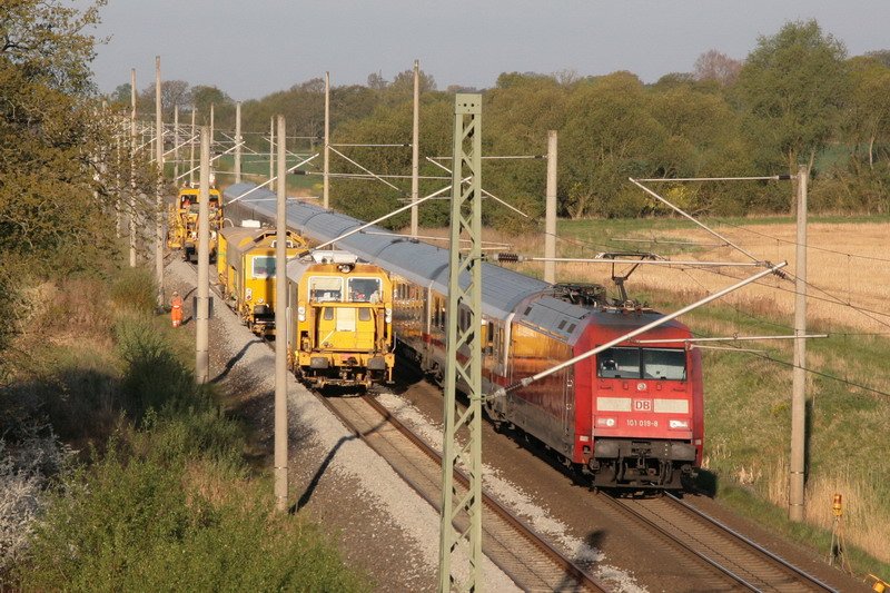 101 034-7 "InForm" schiebt den IC 2372 Karlsruhe Hbf - Stralsund durch Radbruch Richtung Hamburg-Harburg. Aufgenommen am 18.04.09.