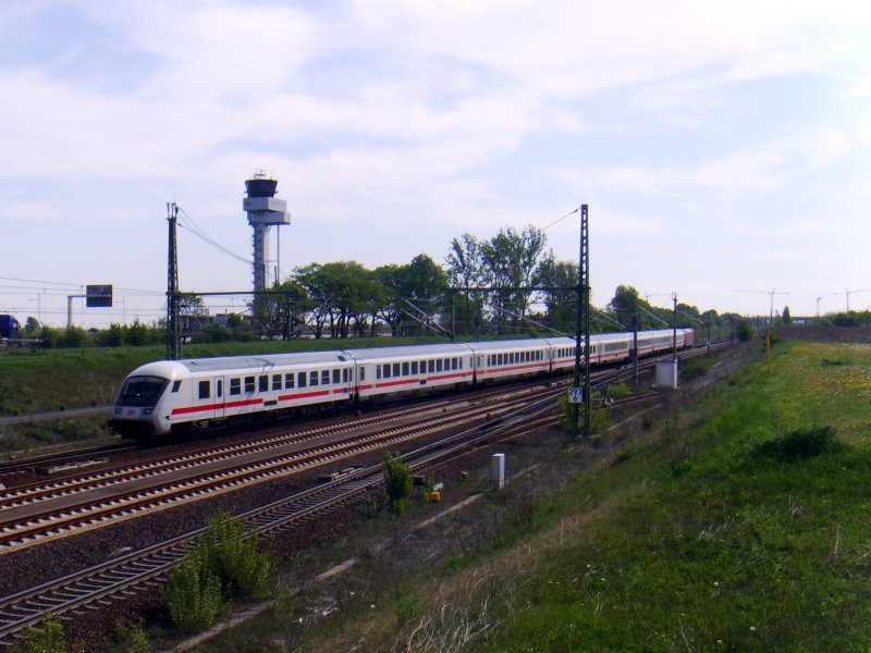 IC 2048 nach Köln erreicht am 27.04.2009 den Flughafenbahnhof der Messestadt Leipzig. In der Bildmitte ist der Tower des Airports zu sehen.