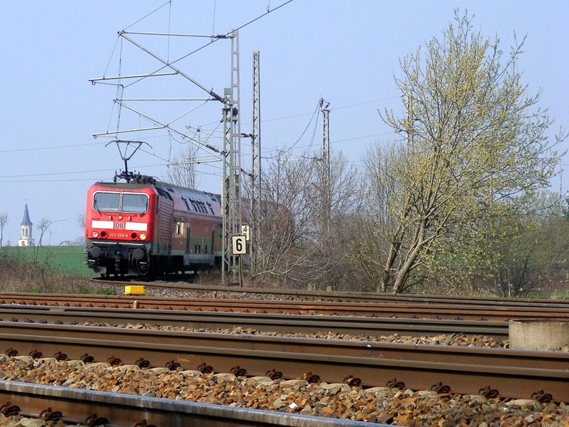 143 278-0 (Was für ein Flickenteppich!) überführt ein paar ältere Doppelstockwagen. Priestewitz am 4.4.2009.