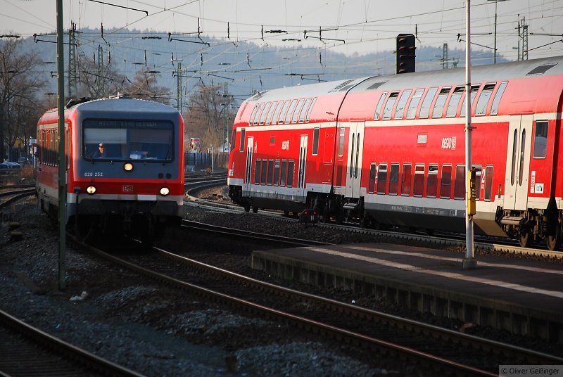 33 Minuten Marburg Hauptbahnhof (II). Genialer Fahrplan, RE 4112 verläßt gerade den Bahnhof, während die Regionalbahn 23626 aus Erndtebrück ankommt. Die Verbindung nach Kassel ist planmäßig unmöglich. (03. April 2009, 18:22)
