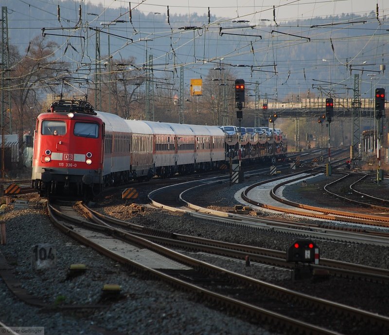 33 Minuten Marburg Hauptbahnhof (V). Überraschung: hier kommt ein Autozug gen Süden mit der Bügelfalte. Übrigens mit blitzsauberem TEE-Speisewagen, den ich leider mangels gutem Bild nicht in die Serie aufnehmen konnte. (03. April 2009, 18:24)
