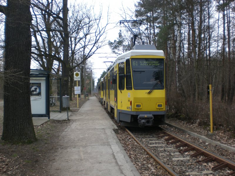Berlin: Straßenbahnlinie 61 nach S-Bahnhof Adlershof an der Haltestelle Rahnsdorf Waldschänke.