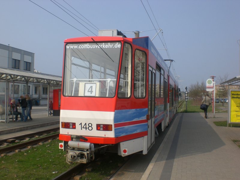 Cottbus: Straßenbahnlinie 4 nach Sachsendorf an der Haltestelle Stadtpromenade.