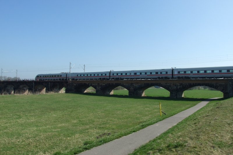 ICE 1708 aus München kommend, fährt hier über die Saale-Brücke bei Bad Dürrenberg.