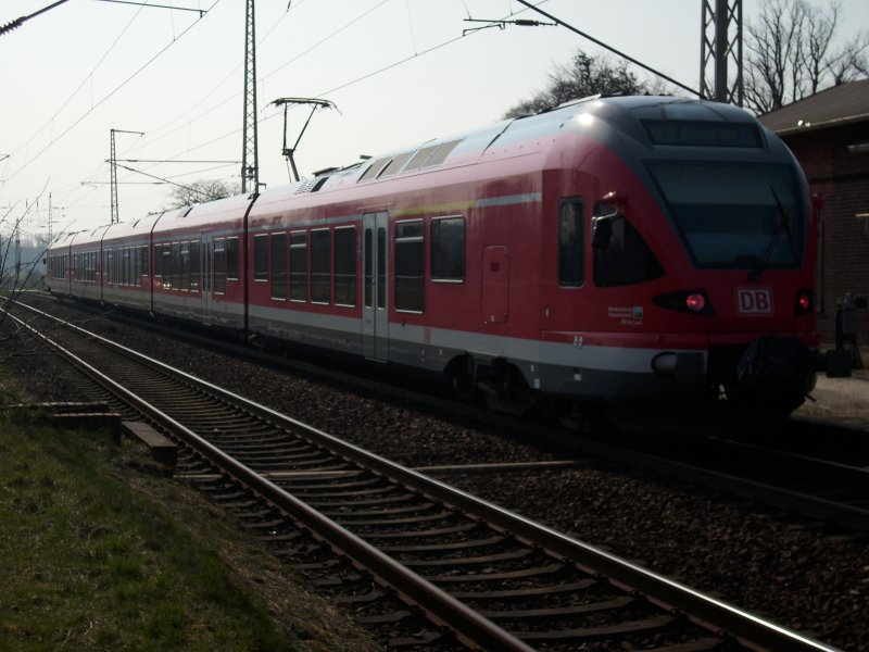 Wenige Sekunden Aufenthalt für Flirt 429 029 am 04.April 2009 als RE 33216 Sassnitz-Rostock in Teschenhagen.