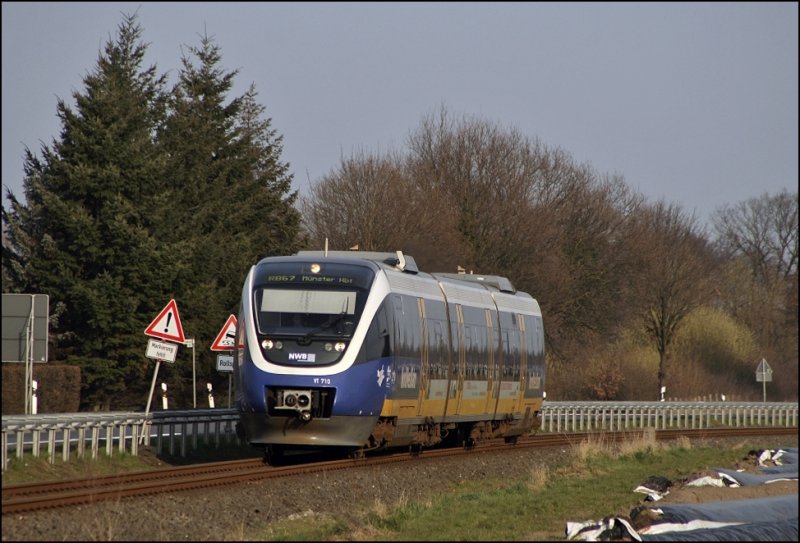 Nachdem der Lehrgangstag beendet war, wurde der Streckenabschnitt zwischen Warendorf und Beelen ins Visier genommen: Am 01.04.2009 konnten VT747 und VT716 als RB67 (NWB81556) "DER WARENDORFER", Münster(Westf)Hbf - Bielefeld Hbf, abgelichtet werden. Zugverfolgungen sind hier unmöglich...