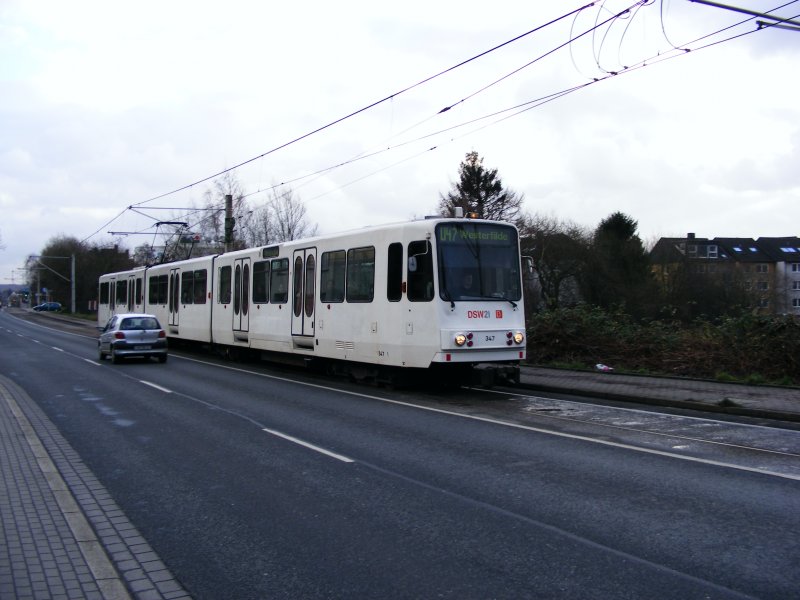 Ein dreiteiliger Stadtbahnwagen B der Dortmunder Stadtwerke auf der Marsbruchstraße in Aplerbeck als Zug der Linie U47 nach Westerfilde am 19. Dezember 2008.