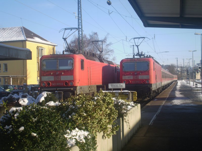 143 869 und 143 876 stehen bereit in Ansbach um ihre REs in den Nürnberger Hbf zu schieben. 143 869 brachte ihren Einsatz etwas später. Ansbach 29.12.08
