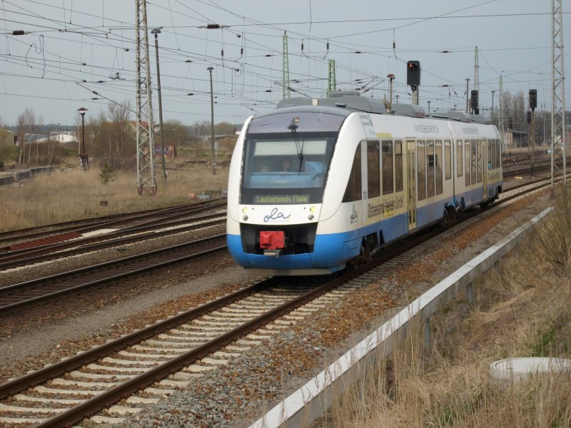 OLA-Triebwagen 701 verläßt am 08.April 2009 den Bahnhof Bergen/Rügen in Richtung Lauterbach Mole.